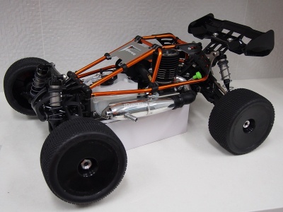 Despite the complex appearance, the lightweight and impact resistant aluminum tubular cage can be hinged forward quickly with the simple removal of four screws, providing quick access to the chassis and engine components. Orange anodized aluminum chassis parts compliment the roll cage assembly for an eye catching look. Front king pin c-hub suspension, 3 differential drive train and 17mm big bore shocks round out this impressive package.